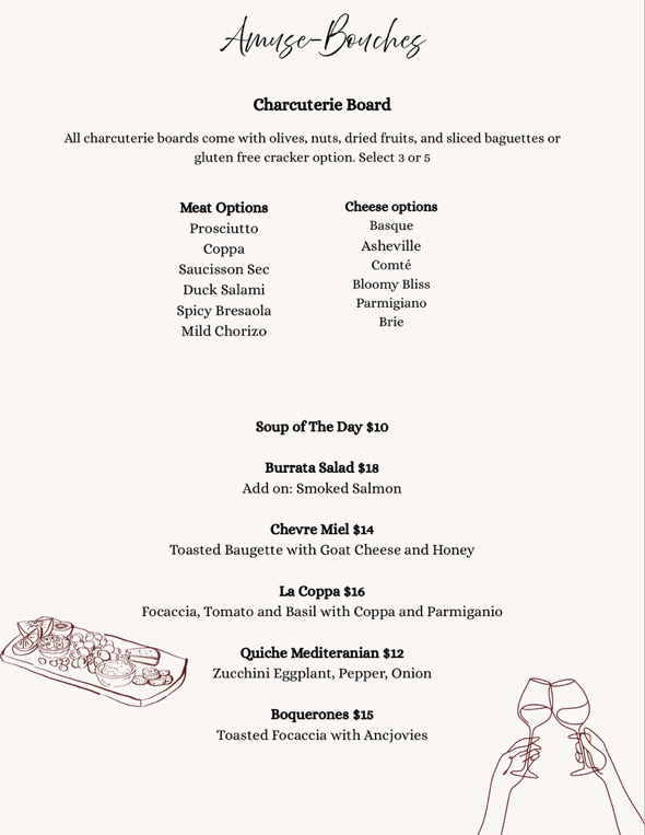 Select 3 premium meats and cheeses or an amuse-bouche, and enjoy any glass of wine under $17 from our curated list.